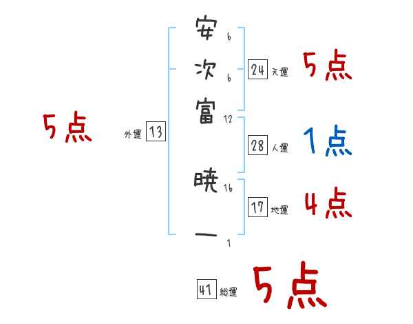 人運![]() | 安次富暁一さんの人運は28画の1つ星!家庭環境に注意。スポーツで活躍できる能力があるかも。 性格や才能などを表す2番目に重要な運勢です。人間関係や協調性、社会的な成功に影響します。主に20歳から50歳ぐらいまでの中年期の運勢を表します。 |