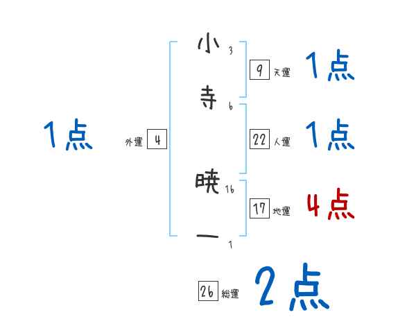 総運![]() | 小寺暁一さんの総運は26画の2つ星!波瀾万丈かも。信頼できる人を大事にしましょう。 あなたの人生を表す1番重要な運勢です。生涯を通じて影響する総合運となり、主に50歳以降の晩年期に影響を及ぼします。 |