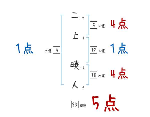 天運![]() | 二上暁人さんの天運は5画の4つ星!健康で安泰。協調性に優れ、財産に恵まれる。 家系が持つ宿命的な運勢を表します。祖先から受け継いだ苗字ですので自分の力が及びません。家柄を象徴します。 |