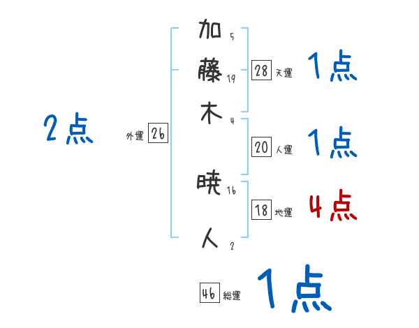 天運![]() | 加藤木暁人さんの天運は28画の1つ星!家庭環境に注意。スポーツで活躍できる能力があるかも。 家系が持つ宿命的な運勢を表します。祖先から受け継いだ苗字ですので自分の力が及びません。家柄を象徴します。 |