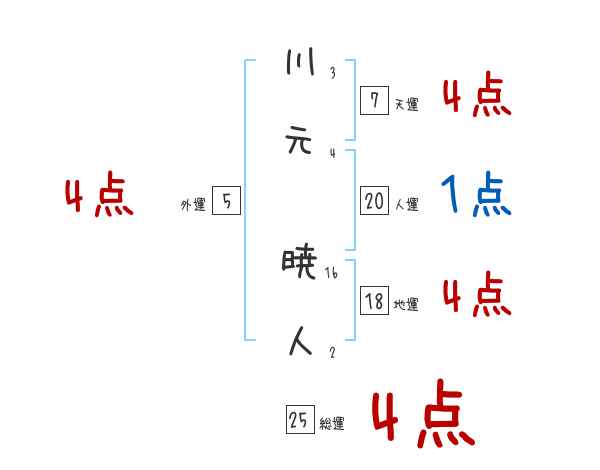 天運![]() | 川元暁人さんの天運は7画の4つ星!強い意志や信念を持ち独立心が強い。自立する。 家系が持つ宿命的な運勢を表します。祖先から受け継いだ苗字ですので自分の力が及びません。家柄を象徴します。 |