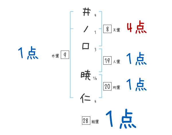 総運![]() | 井ノ口暁仁さんの総運は28画の1つ星!家庭環境に注意。スポーツで活躍できる能力があるかも。 あなたの人生を表す1番重要な運勢です。生涯を通じて影響する総合運となり、主に50歳以降の晩年期に影響を及ぼします。 |