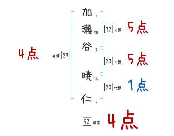 総運![]() | 加瀬谷暁仁さんの総運は52画の4つ星!先見性と独創性に優れ考える力がある。強運の持ち主。 あなたの人生を表す1番重要な運勢です。生涯を通じて影響する総合運となり、主に50歳以降の晩年期に影響を及ぼします。 |