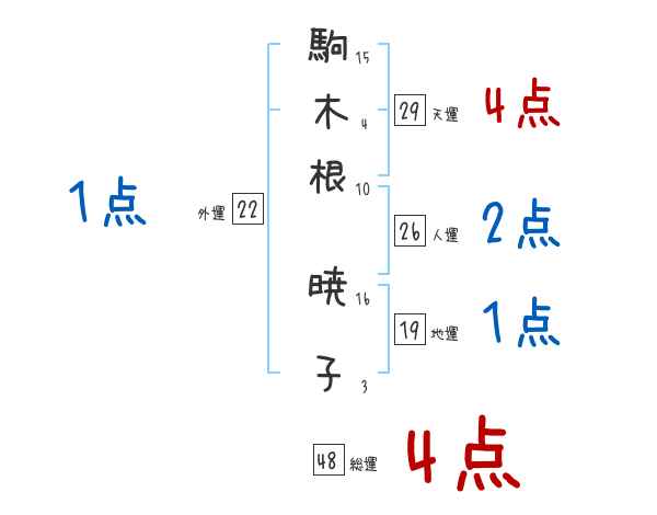 天運![]() | 駒木根暁子さんの天運は29画の4つ星!完全主義で才能がある。厳格な心の持ち主。 家系が持つ宿命的な運勢を表します。祖先から受け継いだ苗字ですので自分の力が及びません。家柄を象徴します。 |