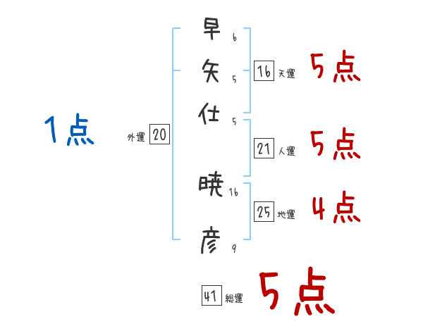 天運![]() | 早矢仕暁彦さんの天運は16画の5つ星!人望が厚く大きく発展する。逆転成功が見える。 家系が持つ宿命的な運勢を表します。祖先から受け継いだ苗字ですので自分の力が及びません。家柄を象徴します。 |