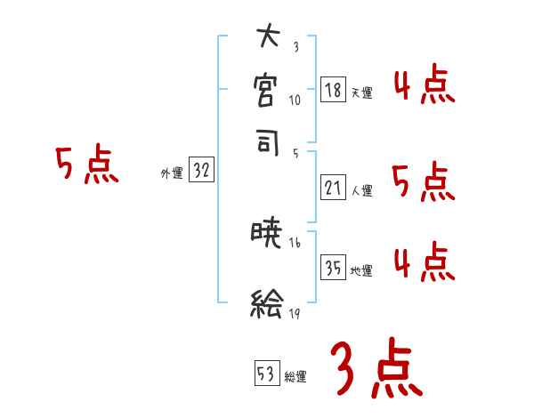 総運![]() | 大宮司暁絵さんの総運は53画の3つ星!やや見栄っ張りで虚栄心がある。散財に注意。 あなたの人生を表す1番重要な運勢です。生涯を通じて影響する総合運となり、主に50歳以降の晩年期に影響を及ぼします。 |