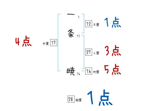 総運![]() | 一条暁さんの総運は28画の1つ星!家庭環境に注意。スポーツで活躍できる能力があるかも。 あなたの人生を表す1番重要な運勢です。生涯を通じて影響する総合運となり、主に50歳以降の晩年期に影響を及ぼします。 |