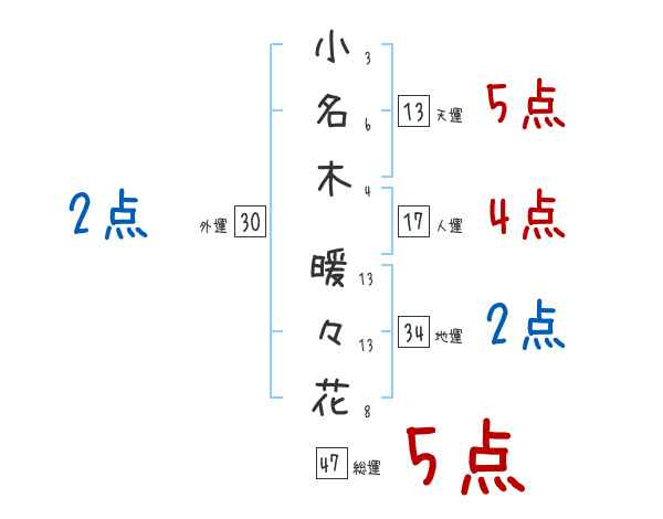 総運![]() | 小名木暖々花さんの総運は47画の5つ星!実力が開花し発展する円満な人生。財に恵まれる。 あなたの人生を表す1番重要な運勢です。生涯を通じて影響する総合運となり、主に50歳以降の晩年期に影響を及ぼします。 |