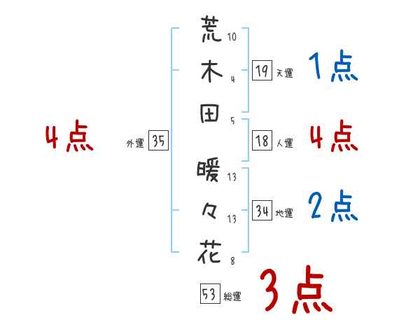 外運![]() | 荒木田暖々花さんの外運は35画の4つ星!温厚な性格で感受性が高い。穏和な性格で人望が厚い。 生活面を象徴する運勢です。外部から受ける影響力を表し、結婚運、家庭運や職場、環境への順応性を表します。 |