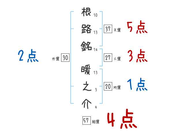 外運![]() | 根路銘暖之介さんの外運は30画の2つ星!浮き沈みの激しさに注意しましょう。 生活面を象徴する運勢です。外部から受ける影響力を表し、結婚運、家庭運や職場、環境への順応性を表します。 |