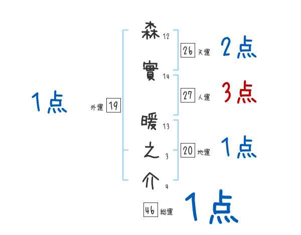 総運![]() | 森實暖之介さんの総運は46画の1つ星!迷走することが多く苦労するかも。目先のことにとらわれないように。 あなたの人生を表す1番重要な運勢です。生涯を通じて影響する総合運となり、主に50歳以降の晩年期に影響を及ぼします。 |