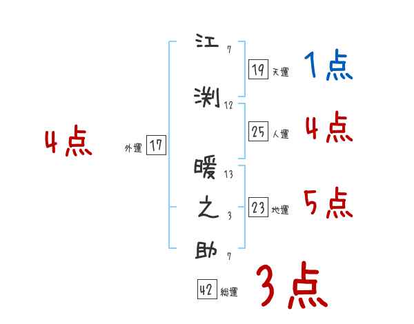 総運![]() | 江渕暖之助さんの総運は42画の3つ星!病気に注意。多芸であるが消極的でおとなしい。 あなたの人生を表す1番重要な運勢です。生涯を通じて影響する総合運となり、主に50歳以降の晩年期に影響を及ぼします。 |