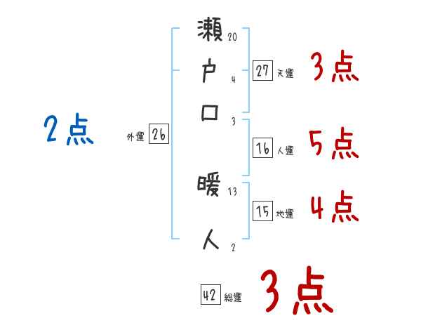 人運![]() | 瀬戸口暖人さんの人運は16画の5つ星!人望が厚く大きく発展する。逆転成功が見える。 性格や才能などを表す2番目に重要な運勢です。人間関係や協調性、社会的な成功に影響します。主に20歳から50歳ぐらいまでの中年期の運勢を表します。 |