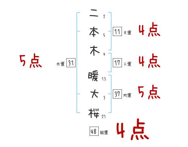 天運![]() | 二本木暖大桜さんの天運は11画の4つ星!着実に富や地位を得る幸運な人生。 家系が持つ宿命的な運勢を表します。祖先から受け継いだ苗字ですので自分の力が及びません。家柄を象徴します。 |