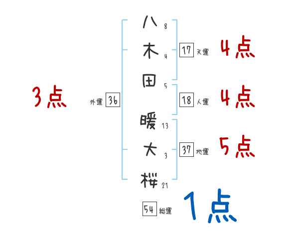 外運![]() | 八木田暖大桜さんの外運は36画の3つ星!先見性が豊かです。多少神経質で苦労することも。 生活面を象徴する運勢です。外部から受ける影響力を表し、結婚運、家庭運や職場、環境への順応性を表します。 |