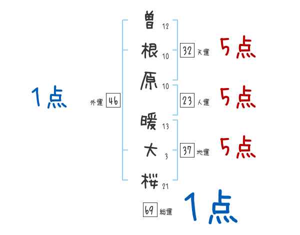 天運![]() | 曽根原暖大桜さんの天運は32画の5つ星!柔軟性があり成功する。チャンスが多く金運が良い。 家系が持つ宿命的な運勢を表します。祖先から受け継いだ苗字ですので自分の力が及びません。家柄を象徴します。 |