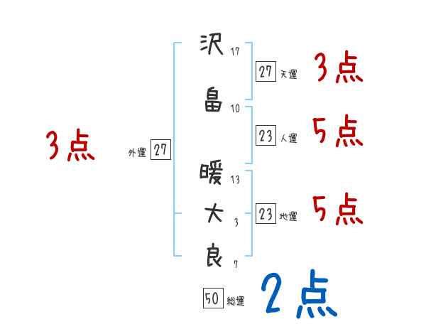 外運![]() | 沢畠暖大良さんの外運は27画の3つ星!頭脳明晰だが強情で摩擦が多い傾向。孤立に注意。 生活面を象徴する運勢です。外部から受ける影響力を表し、結婚運、家庭運や職場、環境への順応性を表します。 |