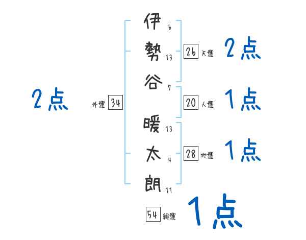 外運![]() | 伊勢谷暖太朗さんの外運は34画の2つ星!独創性に優れるが、自尊心が強く災難に注意しましょう。 生活面を象徴する運勢です。外部から受ける影響力を表し、結婚運、家庭運や職場、環境への順応性を表します。 |
