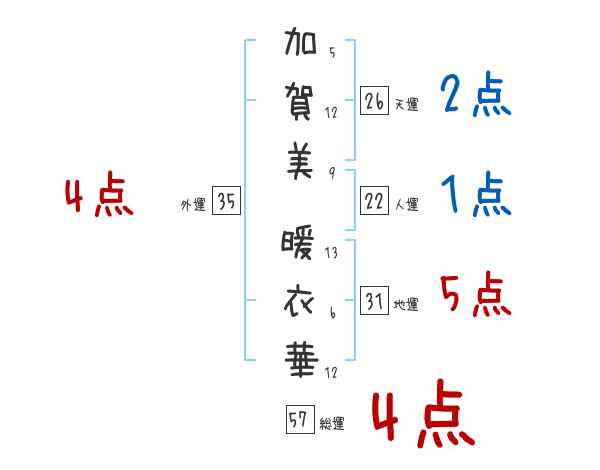 外運![]()  | 加賀美暖衣華さんの外運は35画の4つ星!温厚な性格で感受性が高い。穏和な性格で人望が厚い。 生活面を象徴する運勢です。外部から受ける影響力を表し、結婚運、家庭運や職場、環境への順応性を表します。 |
