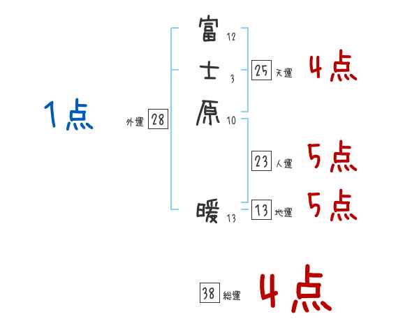 外運![]() | 富士原暖さんの外運は28画の1つ星!家庭環境に注意。スポーツで活躍できる能力があるかも。 生活面を象徴する運勢です。外部から受ける影響力を表し、結婚運、家庭運や職場、環境への順応性を表します。 |