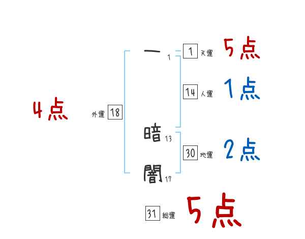 天運![]() | 一暗闇さんの天運は1画の5つ星!行動力、指導力があり出世し繁栄する。幸運に恵まれる。 家系が持つ宿命的な運勢を表します。祖先から受け継いだ苗字ですので自分の力が及びません。家柄を象徴します。 |