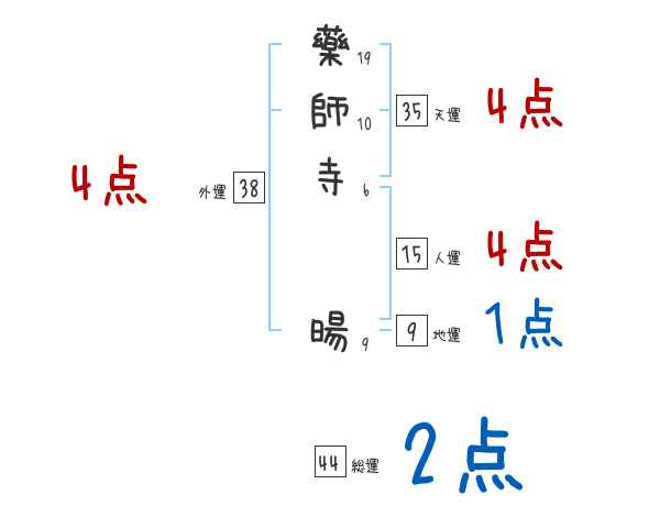 総運![]() | 藥師寺暘さんの総運は44画の2つ星!誠実で慎重な性格。物事を考えすぎないように注意しましょう。 あなたの人生を表す1番重要な運勢です。生涯を通じて影響する総合運となり、主に50歳以降の晩年期に影響を及ぼします。 |