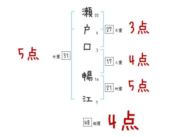 天運![]() | 瀬戸口暢江さんの天運は27画の3つ星!頭脳明晰だが強情で摩擦が多い傾向。孤立に注意。 家系が持つ宿命的な運勢を表します。祖先から受け継いだ苗字ですので自分の力が及びません。家柄を象徴します。 |