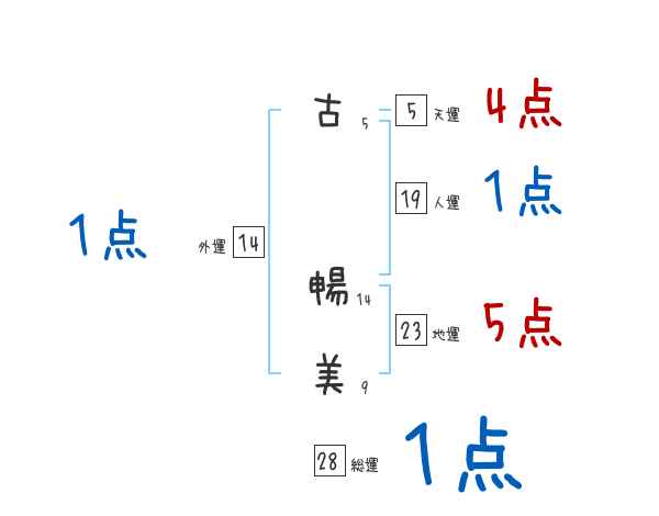 外運![]() | 古暢美さんの外運は14画の1つ星!人に対して優しいがストレスを溜め込みがち。人間関係のトラブルを避けるよう気をつけましょう。 生活面を象徴する運勢です。外部から受ける影響力を表し、結婚運、家庭運や職場、環境への順応性を表します。 |