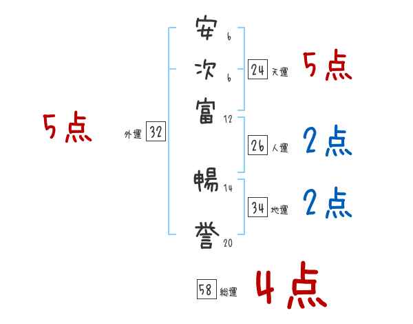 天運![]() | 安次富暢誉さんの天運は24画の5つ星!家庭運が良く順調な人生。金運にも恵まれる。 家系が持つ宿命的な運勢を表します。祖先から受け継いだ苗字ですので自分の力が及びません。家柄を象徴します。 |