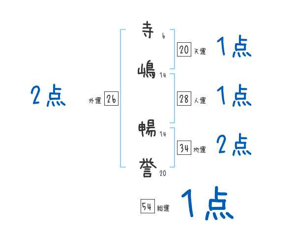外運![]() | 寺嶋暢誉さんの外運は26画の2つ星!波瀾万丈かも。信頼できる人を大事にしましょう。 生活面を象徴する運勢です。外部から受ける影響力を表し、結婚運、家庭運や職場、環境への順応性を表します。 |