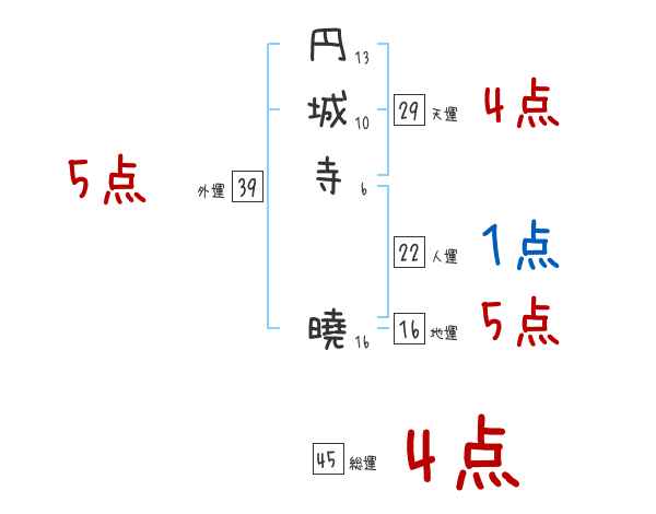 外運![]() | 円城寺曉さんの外運は39画の5つ星!社交性に優れ人望が厚い。人の上に立ち成功する。 生活面を象徴する運勢です。外部から受ける影響力を表し、結婚運、家庭運や職場、環境への順応性を表します。 |