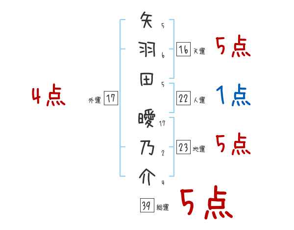 外運![]() | 矢羽田曖乃介さんの外運は17画の4つ星!積極的な行動力。地位を気づき財産を手に入れる。純粋な心と直感力。 生活面を象徴する運勢です。外部から受ける影響力を表し、結婚運、家庭運や職場、環境への順応性を表します。 |