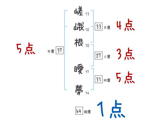 天運![]() | 嵯峨根曖夢さんの天運は33画の4つ星!権力志向でプライドが高い。勇気があり運を切り開き成功する。 家系が持つ宿命的な運勢を表します。祖先から受け継いだ苗字ですので自分の力が及びません。家柄を象徴します。 |