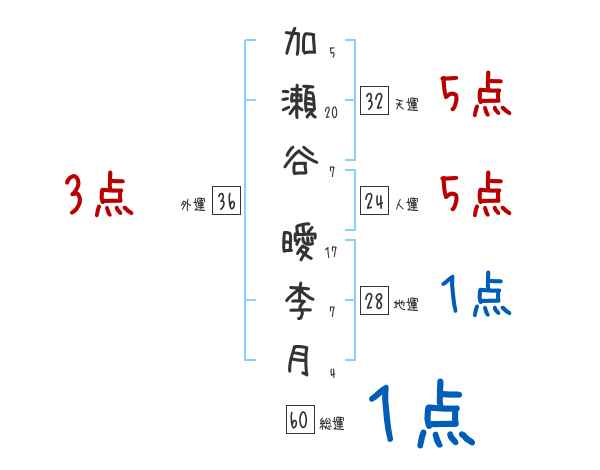天運![]() | 加瀬谷曖李月さんの天運は32画の5つ星!柔軟性があり成功する。チャンスが多く金運が良い。 家系が持つ宿命的な運勢を表します。祖先から受け継いだ苗字ですので自分の力が及びません。家柄を象徴します。 |