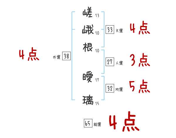 総運![]() | 嵯峨根曖璃さんの総運は65画の4つ星!幸運に恵まれ繁栄する。包容力がある。 あなたの人生を表す1番重要な運勢です。生涯を通じて影響する総合運となり、主に50歳以降の晩年期に影響を及ぼします。 |