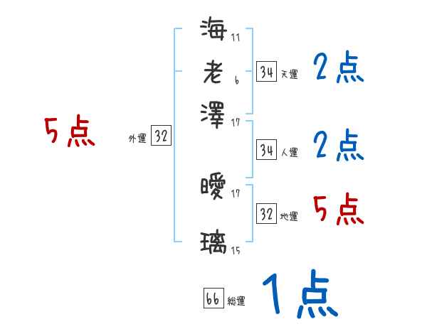 外運![]() | 海老澤曖璃さんの外運は32画の5つ星!柔軟性があり成功する。チャンスが多く金運が良い。 生活面を象徴する運勢です。外部から受ける影響力を表し、結婚運、家庭運や職場、環境への順応性を表します。 |