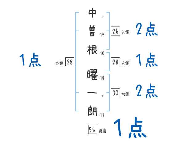 外運![]() | 中曽根曜一朗さんの外運は28画の1つ星!家庭環境に注意。スポーツで活躍できる能力があるかも。 生活面を象徴する運勢です。外部から受ける影響力を表し、結婚運、家庭運や職場、環境への順応性を表します。 |