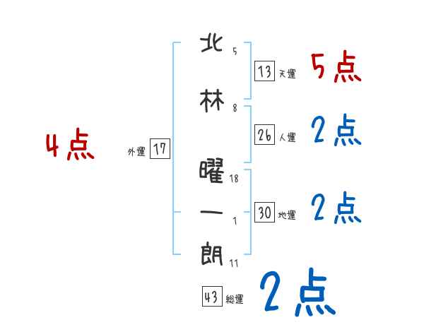 天運![]() | 北林曜一朗さんの天運は13画の5つ星!才能に恵まれ人気がある。名声を手に入れる。円満な人生。 家系が持つ宿命的な運勢を表します。祖先から受け継いだ苗字ですので自分の力が及びません。家柄を象徴します。 |