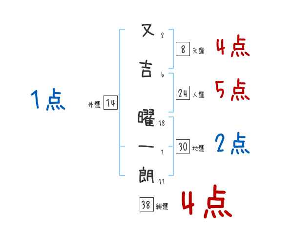外運![]() | 又吉曜一朗さんの外運は14画の1つ星!人に対して優しいがストレスを溜め込みがち。人間関係のトラブルを避けるよう気をつけましょう。 生活面を象徴する運勢です。外部から受ける影響力を表し、結婚運、家庭運や職場、環境への順応性を表します。 |