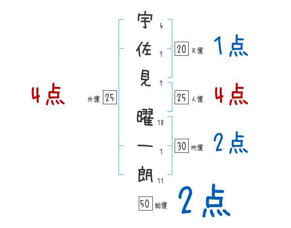 総運![]() | 宇佐見曜一朗さんの総運は50画の2つ星!浮き沈みが激しく不安定。しりすぼみに衰退しやすいので注意しましょう。 あなたの人生を表す1番重要な運勢です。生涯を通じて影響する総合運となり、主に50歳以降の晩年期に影響を及ぼします。 |