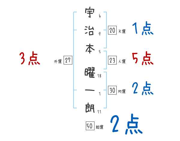 人運![]() | 宇治本曜一朗さんの人運は23画の5つ星!想像力に優れ活力がある。一代で成功し名誉を手に入れる。 性格や才能などを表す2番目に重要な運勢です。人間関係や協調性、社会的な成功に影響します。主に20歳から50歳ぐらいまでの中年期の運勢を表します。 |