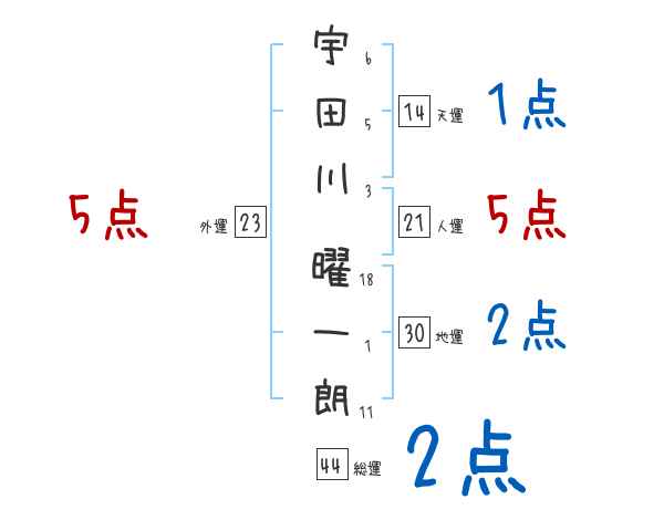 外運![]() | 宇田川曜一朗さんの外運は23画の5つ星!想像力に優れ活力がある。一代で成功し名誉を手に入れる。 生活面を象徴する運勢です。外部から受ける影響力を表し、結婚運、家庭運や職場、環境への順応性を表します。 |
