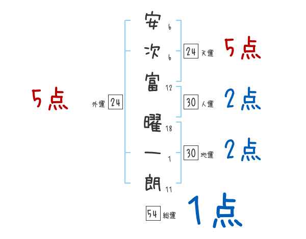 天運![]() | 安次富曜一朗さんの天運は24画の5つ星!家庭運が良く順調な人生。金運にも恵まれる。 家系が持つ宿命的な運勢を表します。祖先から受け継いだ苗字ですので自分の力が及びません。家柄を象徴します。 |