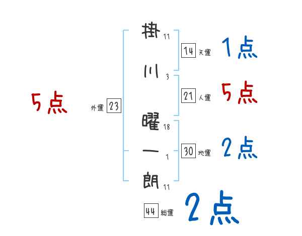 天運![]() | 掛川曜一朗さんの天運は14画の1つ星!人に対して優しいがストレスを溜め込みがち。人間関係のトラブルを避けるよう気をつけましょう。 家系が持つ宿命的な運勢を表します。祖先から受け継いだ苗字ですので自分の力が及びません。家柄を象徴します。 |