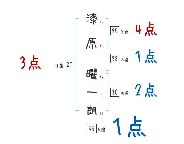 | 人運  | 漆原曜一朗さんの人運は28画の1つ星!家庭環境に注意。スポーツで活躍できる能力があるかも。性格や才能などを表す2番目に重要な運勢です。人間関係や協調性、社会的な成功に影響します。主に20歳から50歳ぐらいまでの中年期の運勢を表します。 |