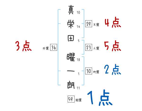 外運![]() | 真栄田曜一朗さんの外運は36画の3つ星!先見性が豊かです。多少神経質で苦労することも。 生活面を象徴する運勢です。外部から受ける影響力を表し、結婚運、家庭運や職場、環境への順応性を表します。 |