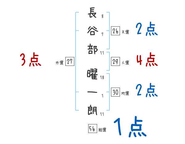 外運![]() | 長谷部曜一朗さんの外運は27画の3つ星!頭脳明晰だが強情で摩擦が多い傾向。孤立に注意。 生活面を象徴する運勢です。外部から受ける影響力を表し、結婚運、家庭運や職場、環境への順応性を表します。 |