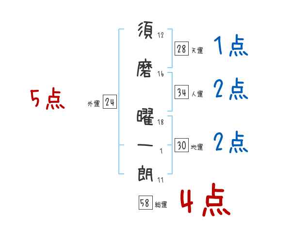 総運![]() | 須磨曜一朗さんの総運は58画の4つ星!安定した生活。大器晩成タイプ。 あなたの人生を表す1番重要な運勢です。生涯を通じて影響する総合運となり、主に50歳以降の晩年期に影響を及ぼします。 |