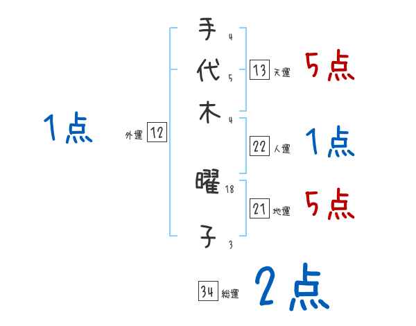 総運![]() | 手代木曜子さんの総運は34画の2つ星!独創性に優れるが、自尊心が強く災難に注意しましょう。 あなたの人生を表す1番重要な運勢です。生涯を通じて影響する総合運となり、主に50歳以降の晩年期に影響を及ぼします。 |