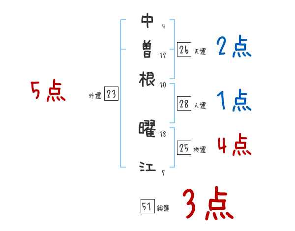 人運![]() | 中曽根曜江さんの人運は28画の1つ星!家庭環境に注意。スポーツで活躍できる能力があるかも。 性格や才能などを表す2番目に重要な運勢です。人間関係や協調性、社会的な成功に影響します。主に20歳から50歳ぐらいまでの中年期の運勢を表します。 |